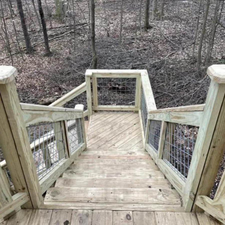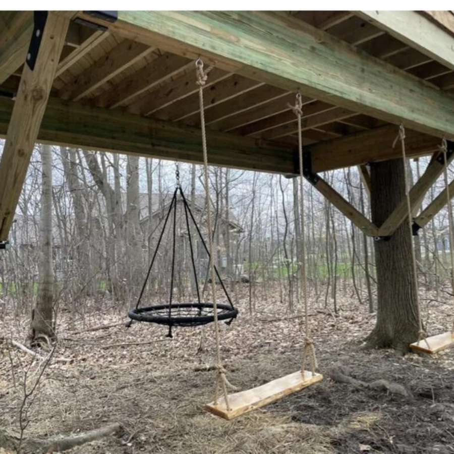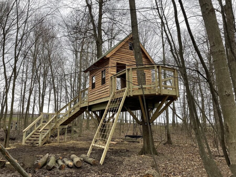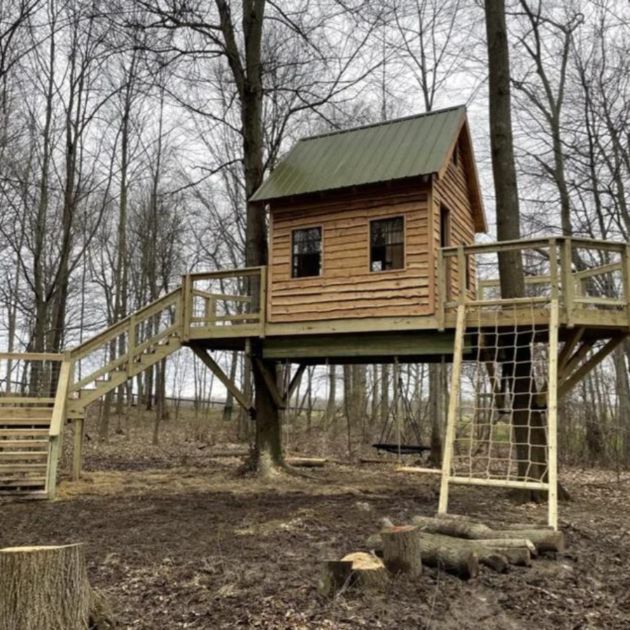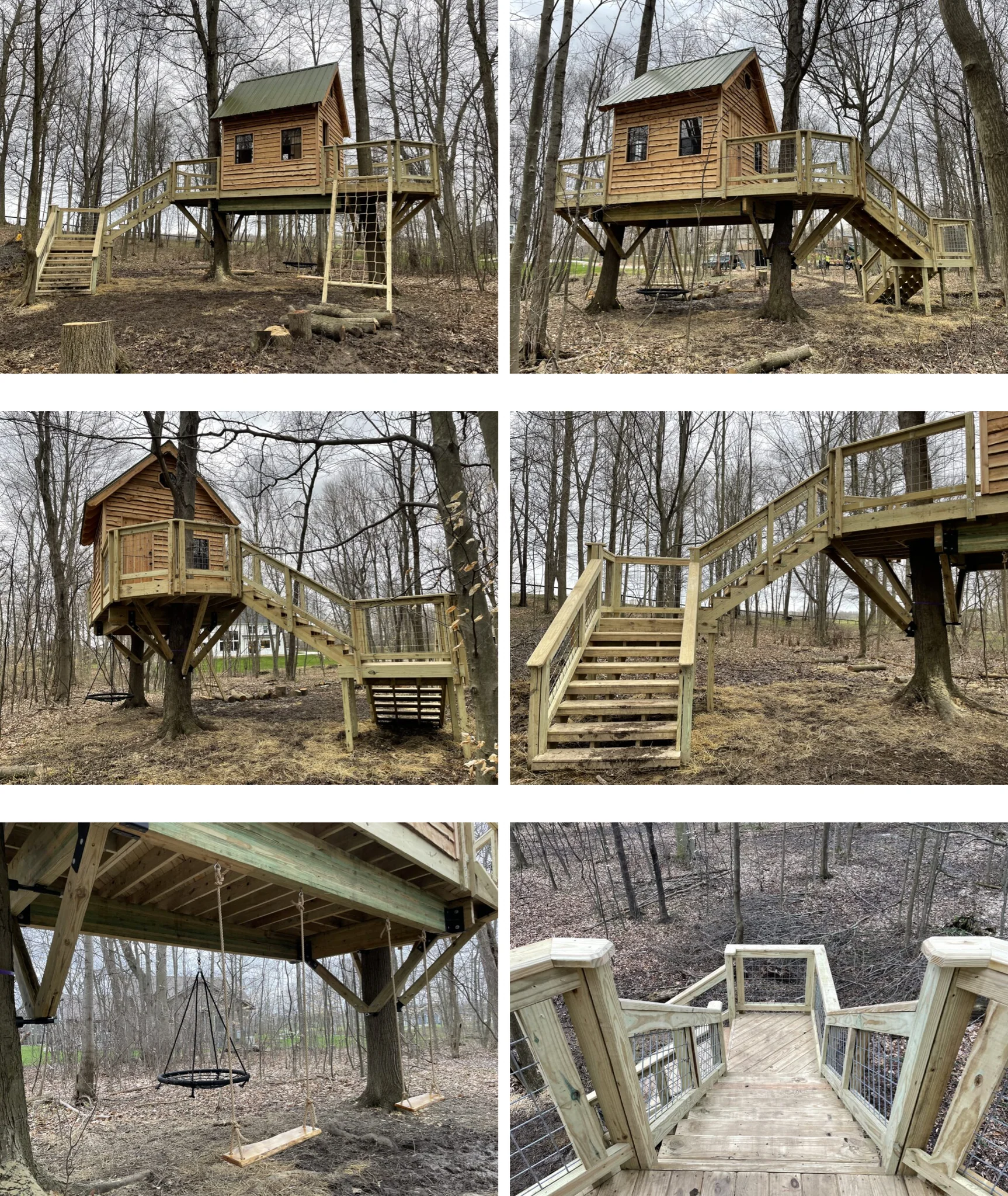 You can’t deny it! The staircase and shaker siding truly make the Treehouse – Model One spectacular. However, sometimes ladders aren’t for everyone, and we felt that using steps would be a perfect alternative to get every family member and friend inside the treehouse. Featured here are beautiful shaker siding, duel decks, multiple swing options, a rope ladder, and a green tin roof.